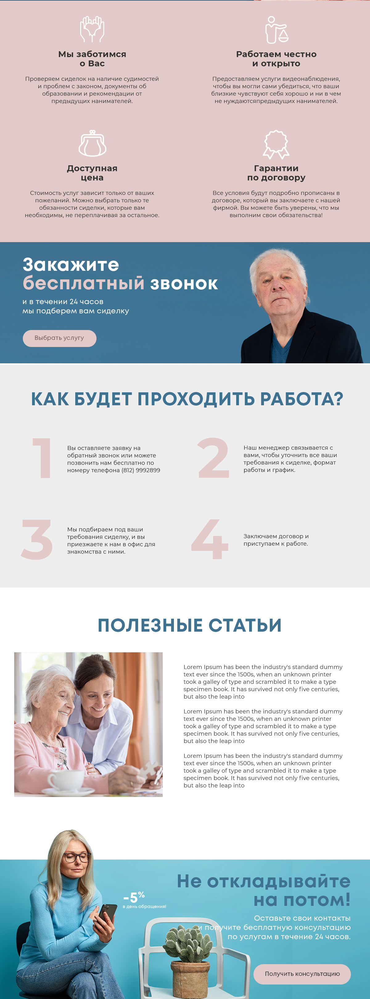 Сайт сделан лаконичным, простым и в спокойных тонах, для того чтобы не отвлекать клиентов от информации об услугах патронажного агенства. После замены дизайна сайта сразу пошли заявки от клиентов.